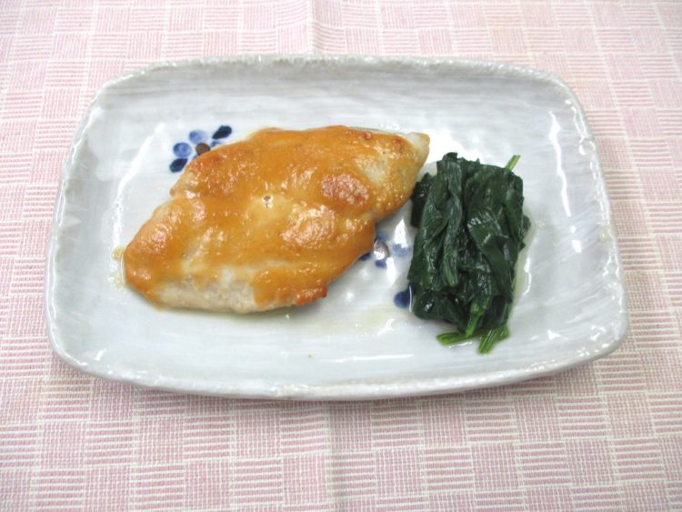 ご飯、豆腐と三つ葉のみそ汁、さわらの味噌マヨネーズ焼き、ふきと豚肉の炒め物、