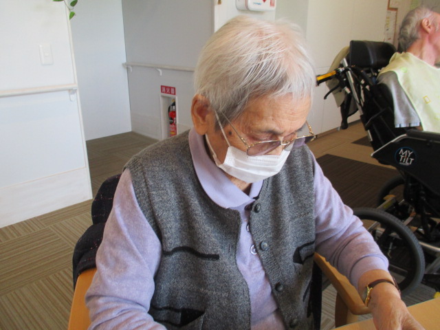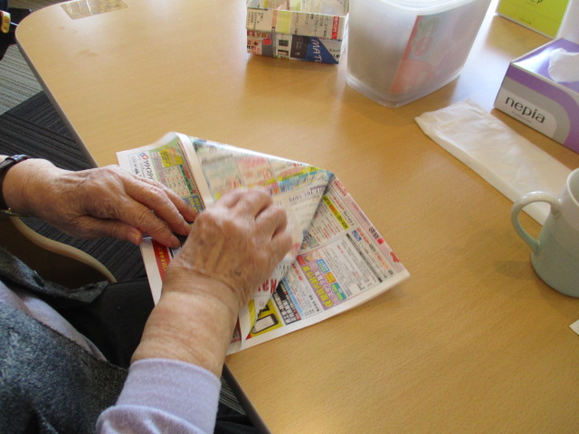 k様入浴後に、水分補給されながらチラシ箱作りを行いました。