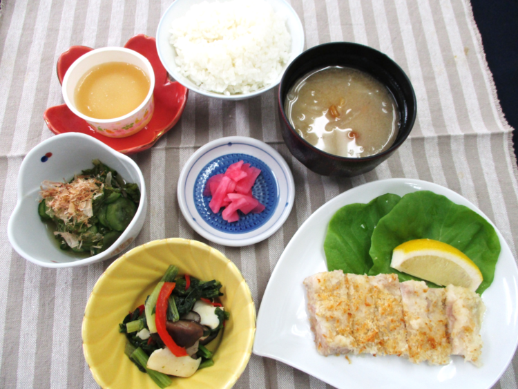 ご飯、なめこと大根のみそ汁、鶏肉のパン粉焼き、小松菜といかのソテー、きゅうりとめかぶの和え物、赤かぶ漬、ももゼリー