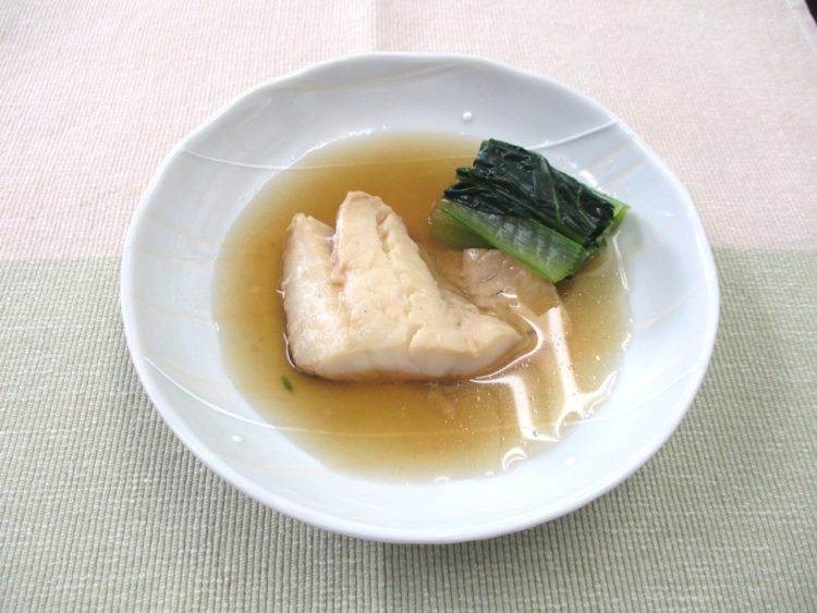ご飯、豆腐とねぎのみそ汁、めばるの煮付け、アスパラとベーコンのソテー、車麩とわかめの辛子和え、なす漬、青りんごゼリー