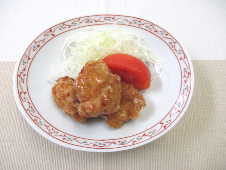 ご飯、細竹とわかめのみそ汁、鶏肉の竜田揚げあんかけ、カリフラワーのケチャップソテー、
