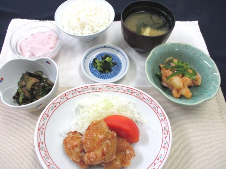 なすと胡瓜のゆかり和え、野沢菜漬、フルーチェ