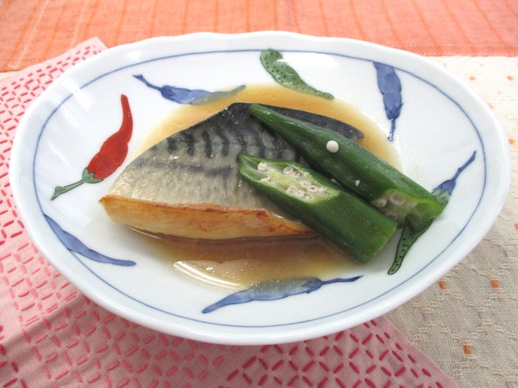 ご飯、花麩とかいわれの清汁、さばの味噌煮、なすのケチャップ炒め、春雨とハムの和え物、