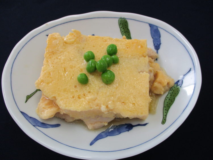 ご飯、里芋とねぎのみそ汁、鶏肉の親子煮、カリフラワーとかにかまのサラダ、枝豆のふっくら揚げ、白菜のさざなみ和え、赤かぶ漬