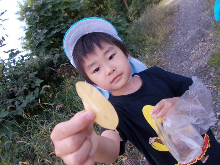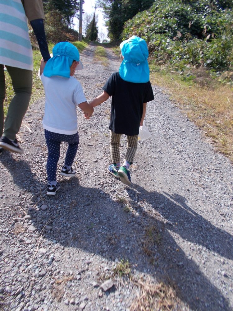 秋とは思えないほど、気温の高い1日となりました。子ども達は、秋を探しに近隣の散策へと出かけました。道路は途中、舗装された道からデコボコの砂利道となりましたが、子どもたちは散歩で鍛えた脚力で目的地めざしてどんどん先へと進みます。