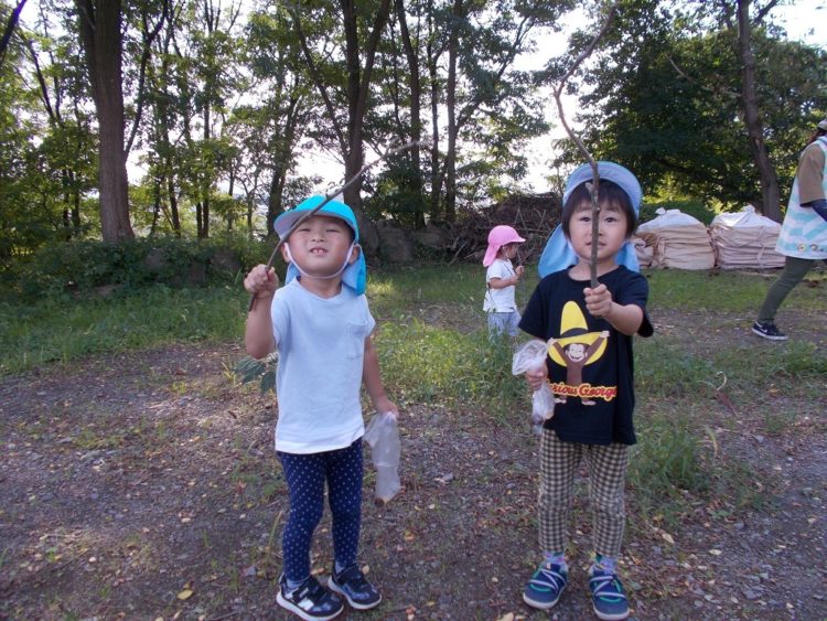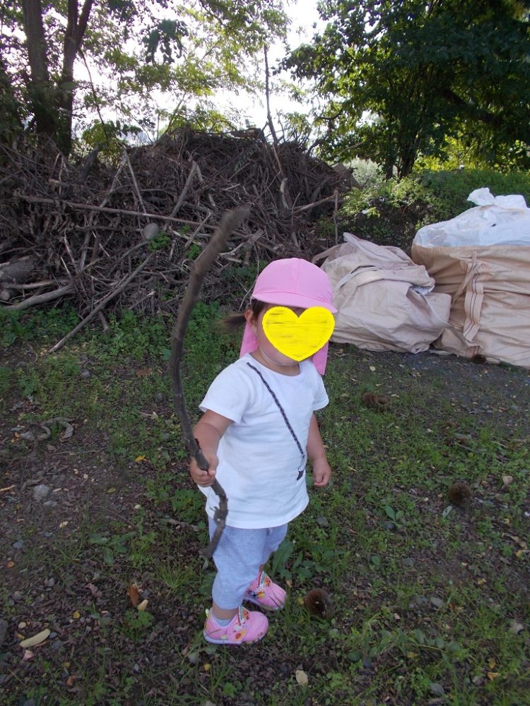 その傍らでは「しぇんしぇー」と呼びかけながら、お兄さんたちの真似をして枝を拾うSちゃん♪いろいろなことにチャレンジし、できることがどんどん増えてきました。
