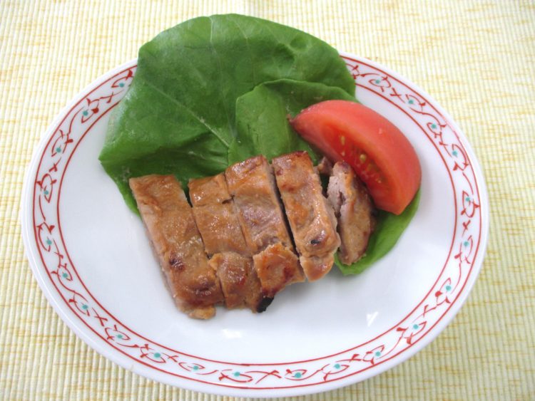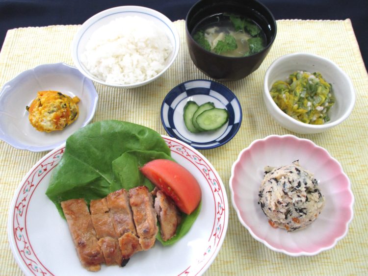 ご飯、たまごスープ、豚肉のみそつけ焼き、卯の花とひじきの炒り煮、かぼちゃサラダ、