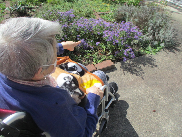 お昼ご飯前に起きたT様が、「なーんぼ天気良いんだ、花っこも咲いてほらぁ」と部屋から外を見て話されていたので、一緒にお散歩に行きました。