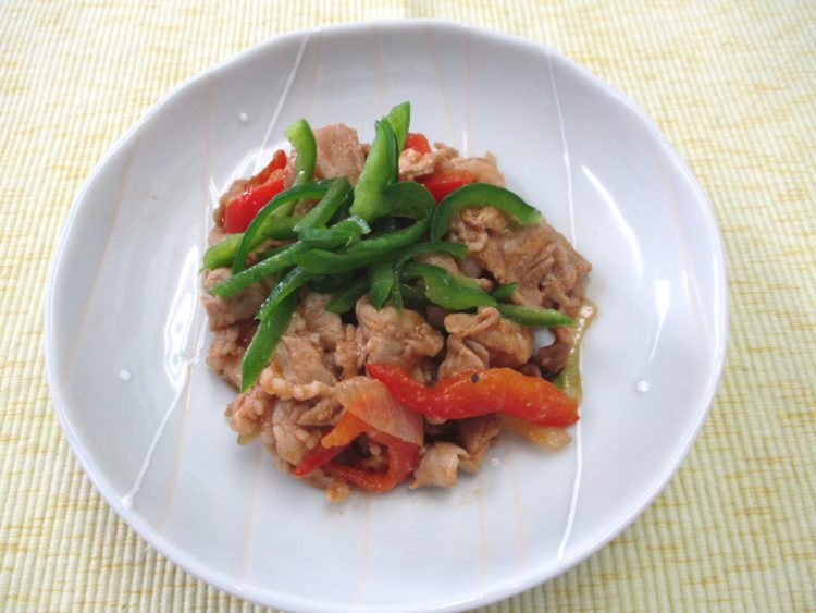 ご飯、豆腐となめこのみそ汁、ポークケチャップソテー、チンゲン菜とえびの炒め物、