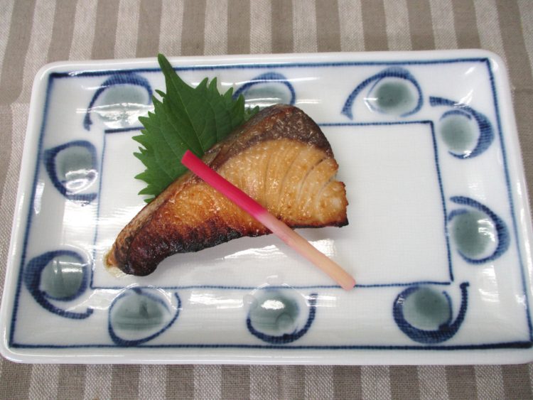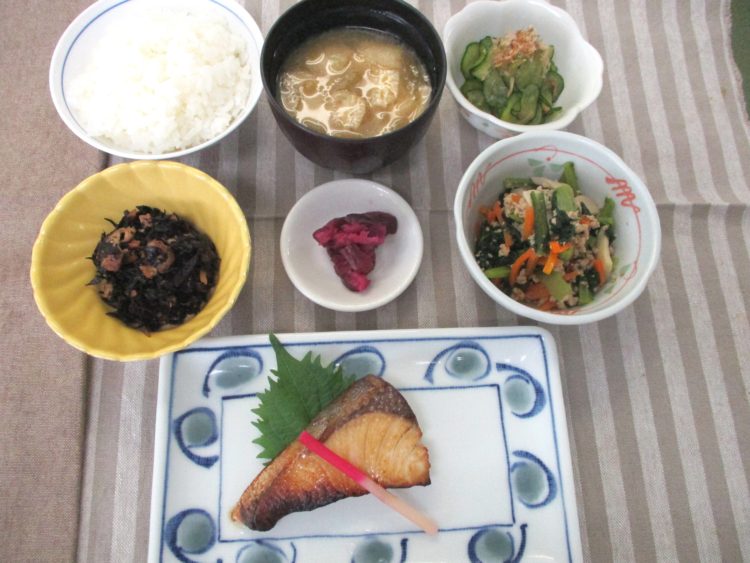 ご飯、ふきと油揚げのみそ汁、ぶりの生姜漬焼き、小松菜とひき肉の炒め物、五目ひじき煮、