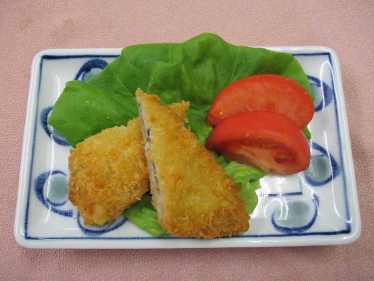 ご飯、豆腐とねぎのみそ汁、白身魚フライ、ふきと鶏肉の煮つけ、スパゲティサラダ、梅吹雪漬、黄桃缶