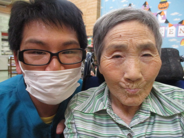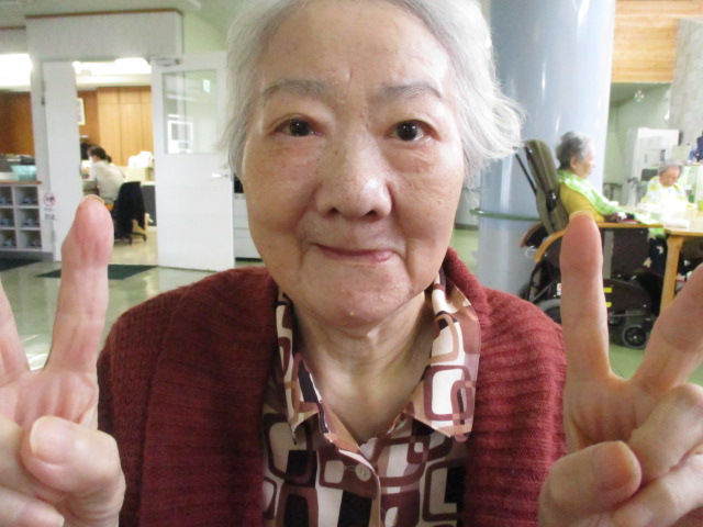 M様は、お部屋から自分で車椅子を漕いでこられ、「頑張ったよ!」とピース☆