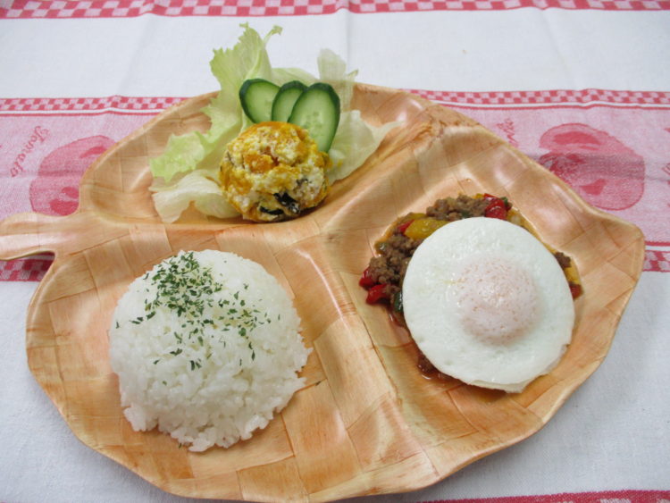 ご飯、きのこスープ、ガパオライス、かぼちゃサラダ、すりおろしりんごゼリー