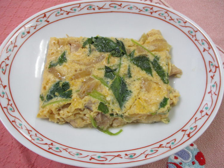 ご飯、あさりとねぎのみそ汁、鶏肉の親子煮、カリフラワーの和風サラダ、茄子の味噌炒め、