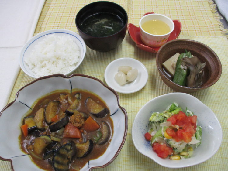 ご飯、わかめスープ、なすとひき肉のカレー、ブロッコリーとツナサラダ、高野豆腐と舞茸の煮しめ、らっきょう漬、ラフランスゼリー