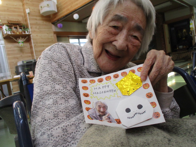 M職員が一生懸命作成したハロウィンカードをプレゼントしました。