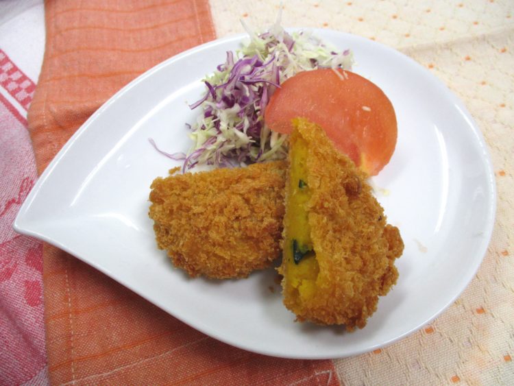 ご飯、コンソメスープ、かぼちゃコロッケ、帆立と椎茸の炊き合わせ、