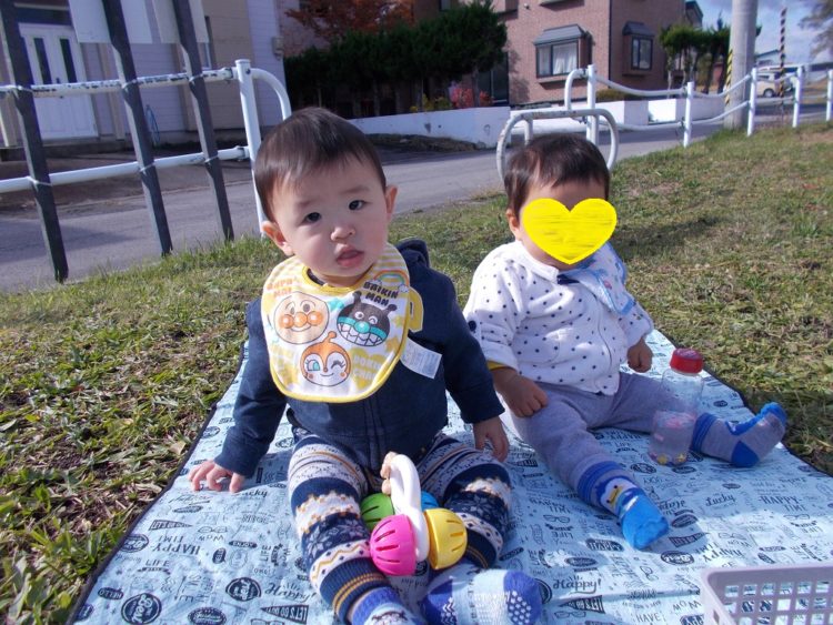 公園の傍らには、冬の風物詩“干し大根”が掛けられ、のどかな風景が広がっていました。子ども達は、きのこのような遊具に上がったり、飛び跳ねたりして、野原を駆けまわり喜んでいました。りす組の2人はピクニックシートに座り、おもちゃで遊んだり、ひなたぼっこをしたり・・・♪