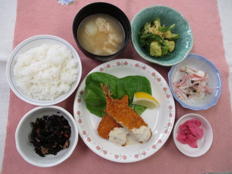 ご飯、じゃが芋とみそ汁のみそ汁、あじフライ、カリフラワーのカレー炒め、かぶとハムのサラダ、五目ひじき煮、梅吹雪漬