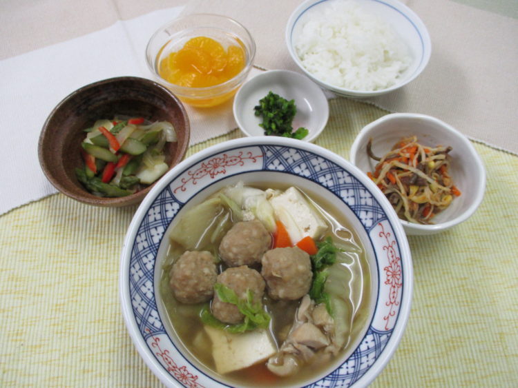 ご飯、鶏なべ、アスパラといかのソテー、和風ナムル、青じその実漬、みかん缶
