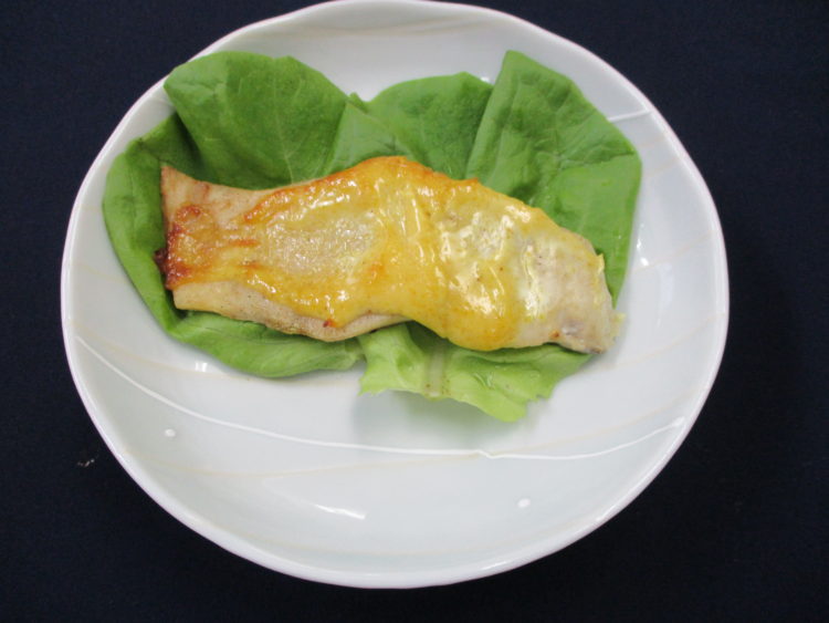 ご飯、花麩とあさつきのみそ汁、シルバーの黄金焼き、なすと鶏肉の炒め物、コーンシュウマイ、小松菜のお浸し、かつおたくあん漬