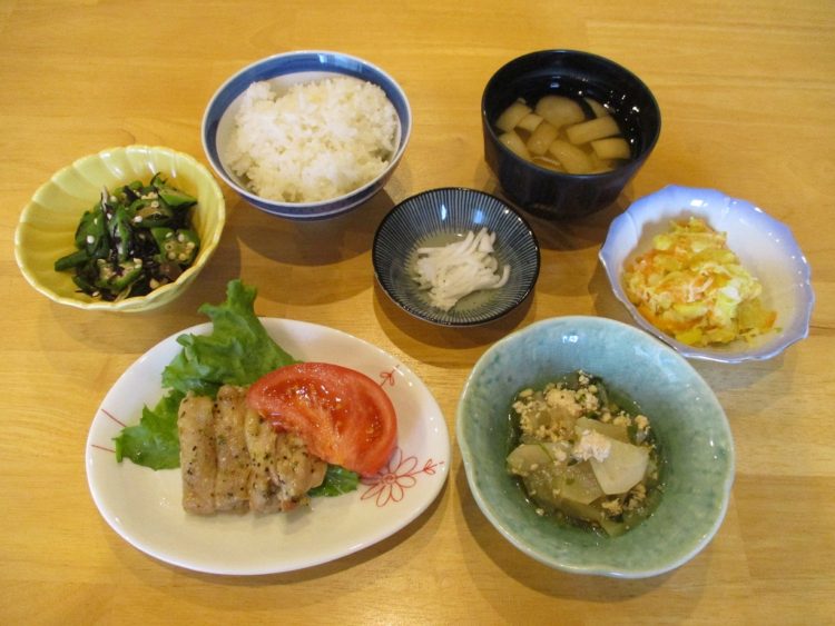 ご飯、板麩のみそ汁、鶏肉の塩ダレ焼き、かぶの煮物、オクラの和え物、さつま芋のサラダ、