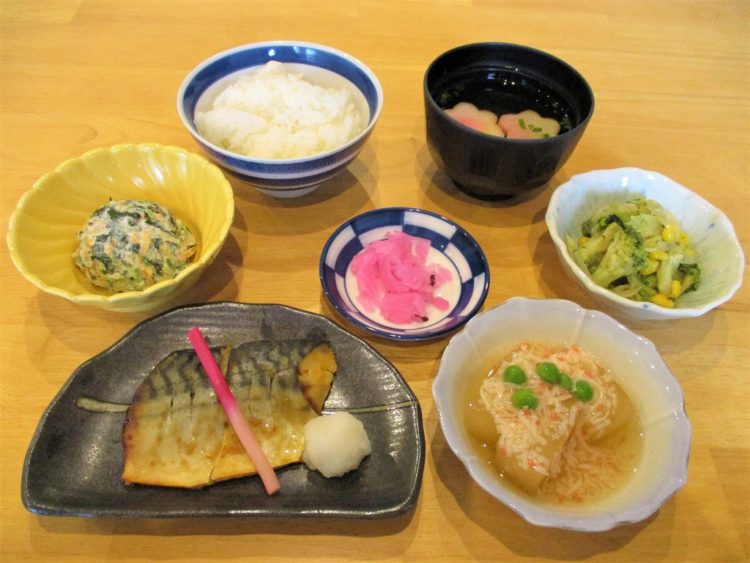 ご飯、花麩のすまし汁、さばのみそ漬け焼き、冬瓜の煮物、ブロッコリーの炒め物、