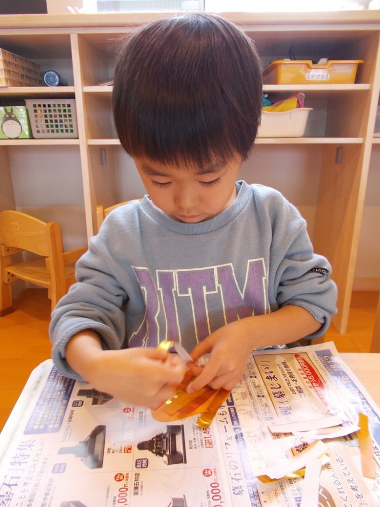 うさぎ組さんは折り紙をビリビリちぎり、ぞう組さんはハサミでチョキチョキがんばりました!