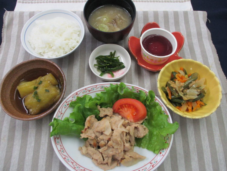 ご飯、舞茸とねぎのみそ汁、豚肉のオイスターソース焼き、いんげんとツナのソテー、焼き茄子の生姜煮、わかめ磯漬、ぶどうゼリー