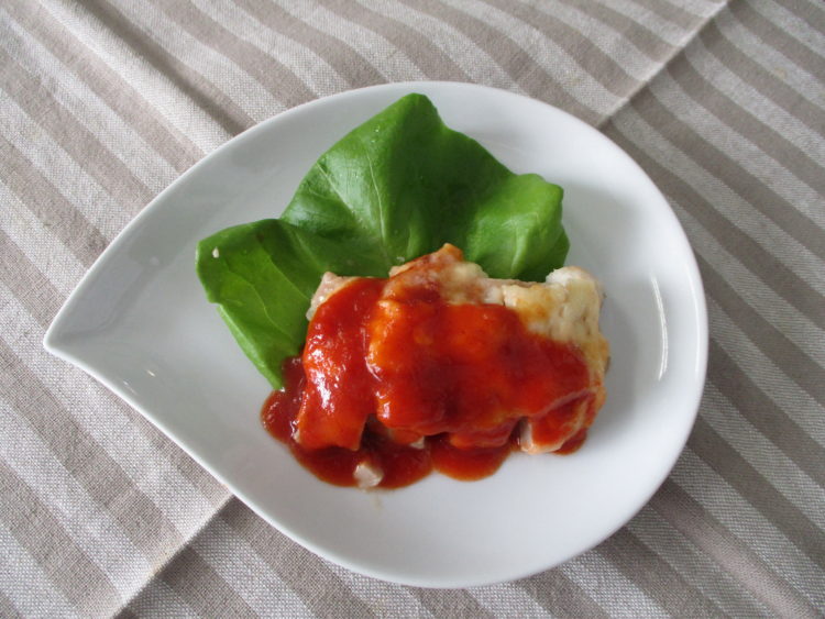 ご飯、白菜と油揚げのみそ汁、鶏肉のチーズ焼き、里芋といかの煮物、かつおフライ、もやしとカニカマの和え物、キャベツ漬