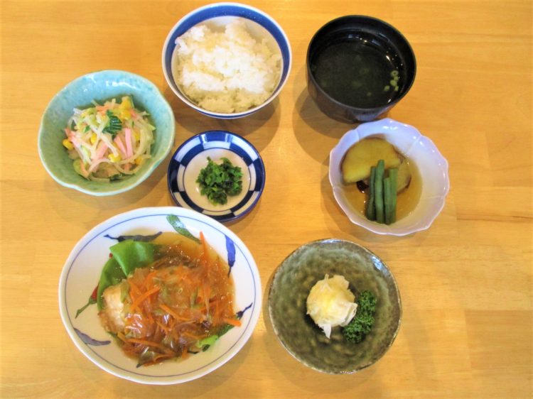 ご飯、わかめスープ、めばるの甘酢あんかけ、豆腐しゅうまい、さつま芋煮、