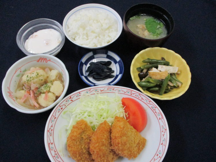 ご飯、あさりと三つ葉のみそ汁、かぼちゃコロッケ、いんげんと生揚げの炒め物、カリフラワーのスープ煮、なす漬、ピーチフルーチェ