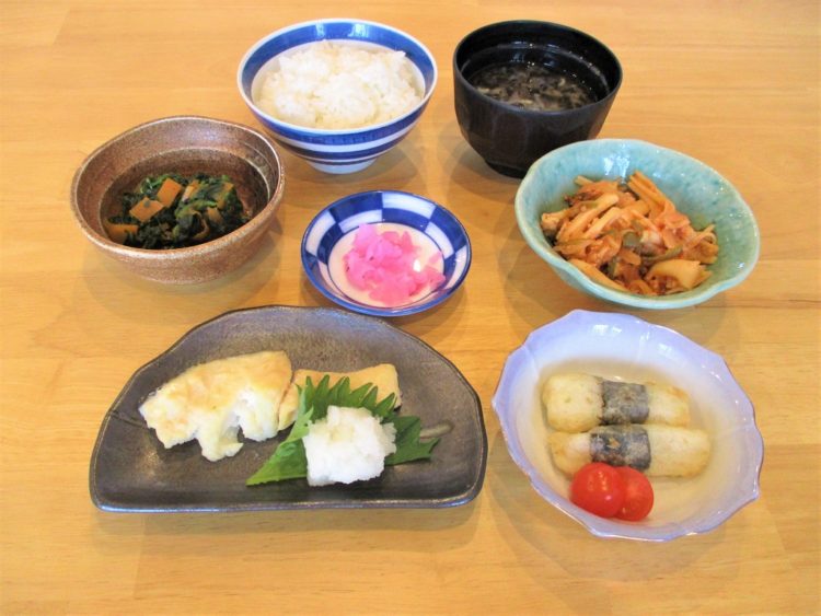 ご飯、岩海苔のみそ汁、たらの西京焼き、長いもの短冊揚げ、マカロニソテー、