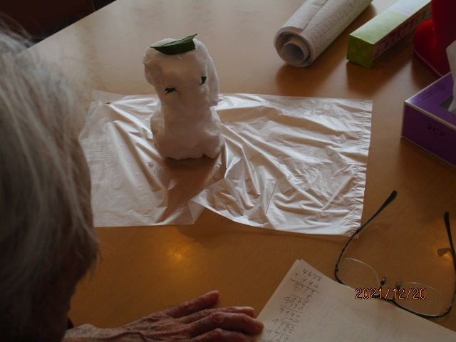 M様は雪だるまに見守られながら脳トレーニング(計算)を