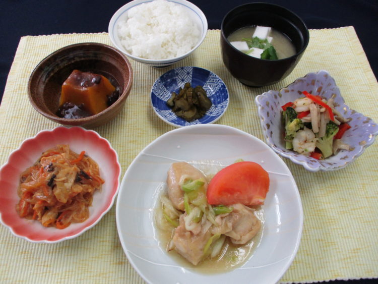 ご飯、はんぺんと三つ葉のみそ汁、鶏肉のねぎ焼き、ブロッコリーとえびの炒め物、南瓜のいとこ煮、春雨サラダ中華風、味きゅうり漬