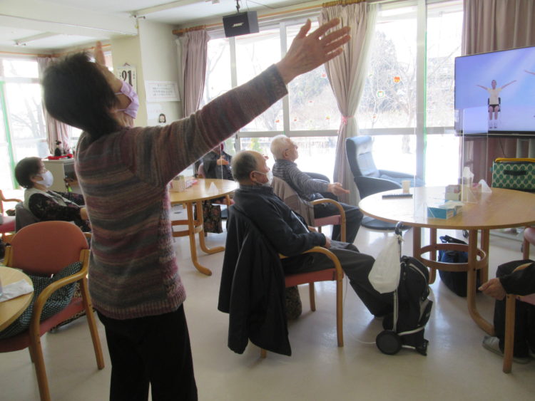 職員と一緒に立って体操を行っている利用者様もいらっしゃいます💪