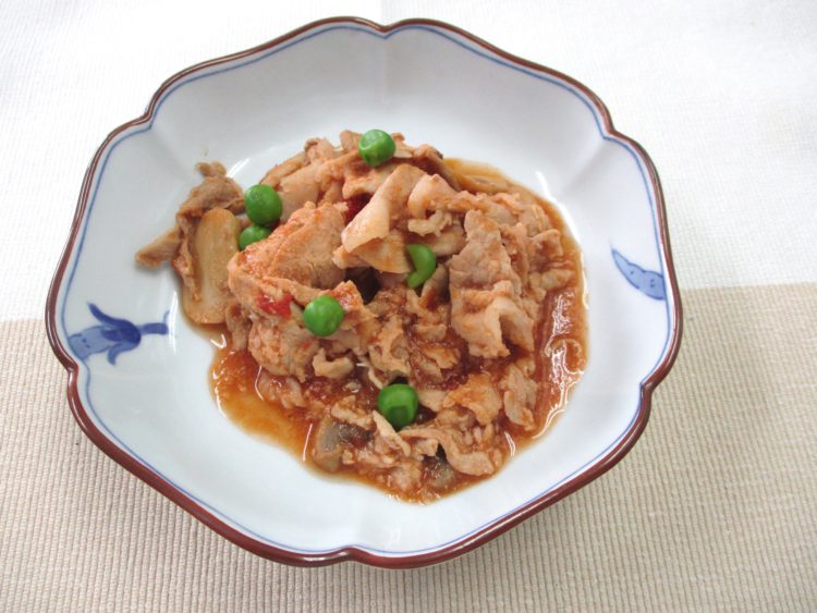 ご飯、もやしと油揚げのみそ汁、豚肉のトマトソース煮、小松菜といかのソテー、塩麴金平、