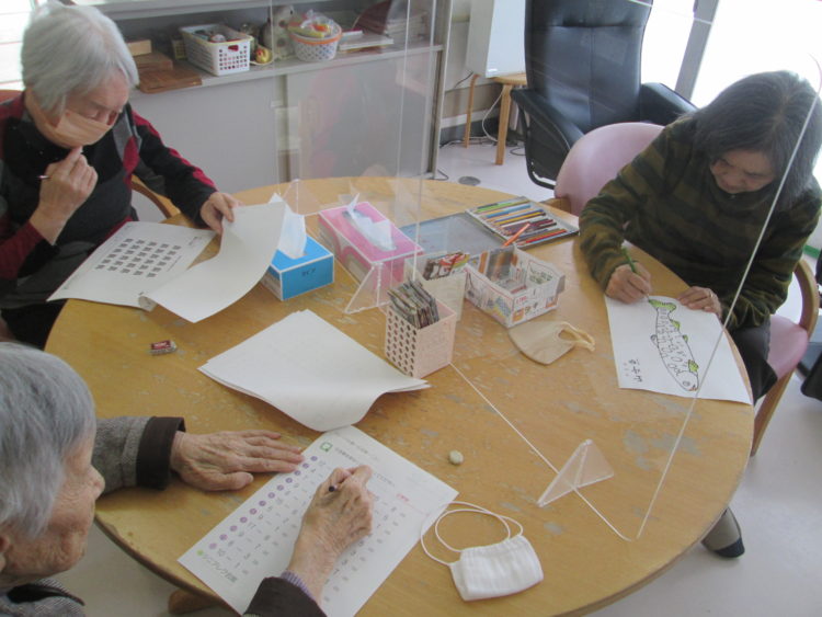 室内での過ごし方としては、午前は入浴され、お昼のメニューは帆立ご飯を頂き、午後からは‘’脳トレ‘’を行いました😆
