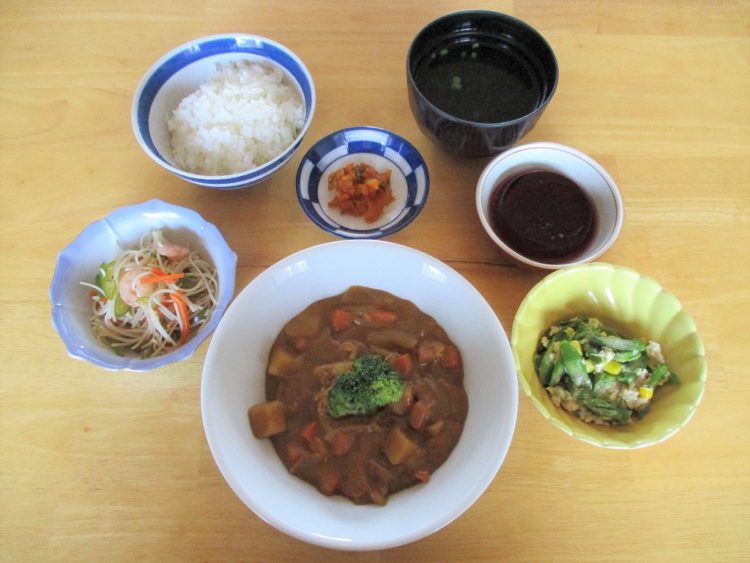 ご飯、わかめのスープ、チキンカレー、ビーフンソテー、アスパラとささみのごま和え、