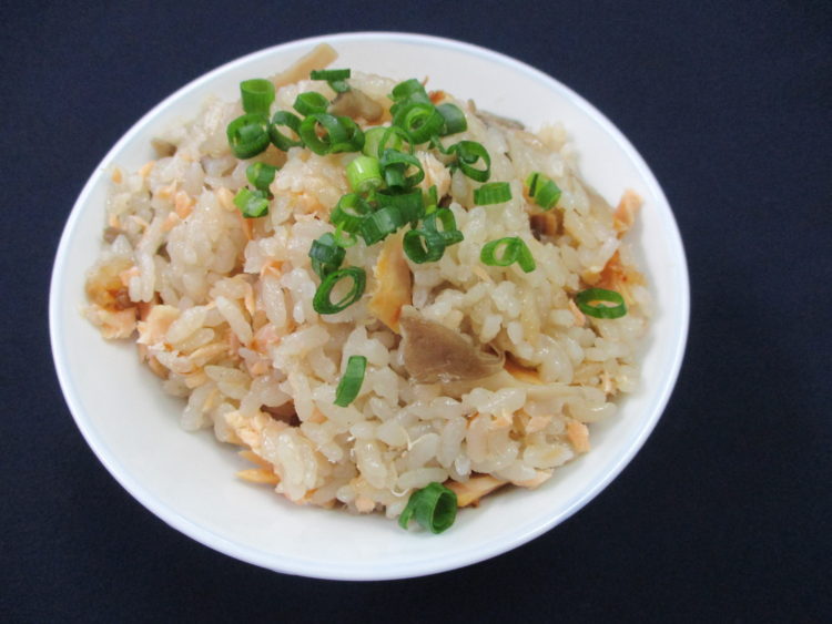 鮭ごはん、長もやしと油揚げのみそ汁、鶏肉の竜田揚げ、マカロニサラダ、白かぶ漬、パイン缶