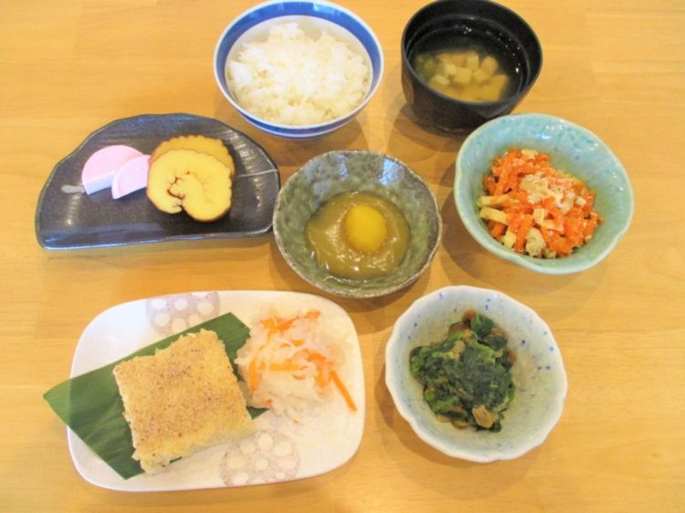 ご飯、オクラのすまし汁、鶏肉の松風焼き、にんじんの子和え、栗きんとん、なめこおろし和え、