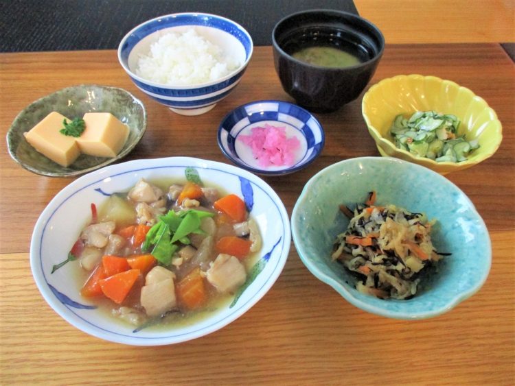 ご飯、舞茸のみそ汁、治部煮、たまご豆腐、切干大根の煮物、胡瓜のわさびマヨ和え、桜大根漬け