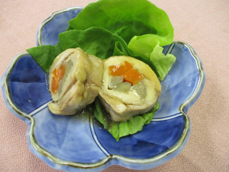 ご飯、あさりとねぎのみそ汁、鶏肉の八幡巻き、キャベツとなるとのソテー、エビカツ、きのこの塩辛、わかめの磯漬