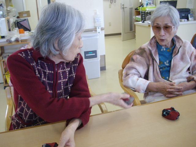 お客様の中には、「昔は自分で作って、近所の子供たちにあげてたの」と話されたり、「前は上手に出来たんだけど、忘れちゃった」とお手玉についてのお話を聞かせて頂きました。その後も昔の遊びや思い出話等で盛り上がっておりました。
