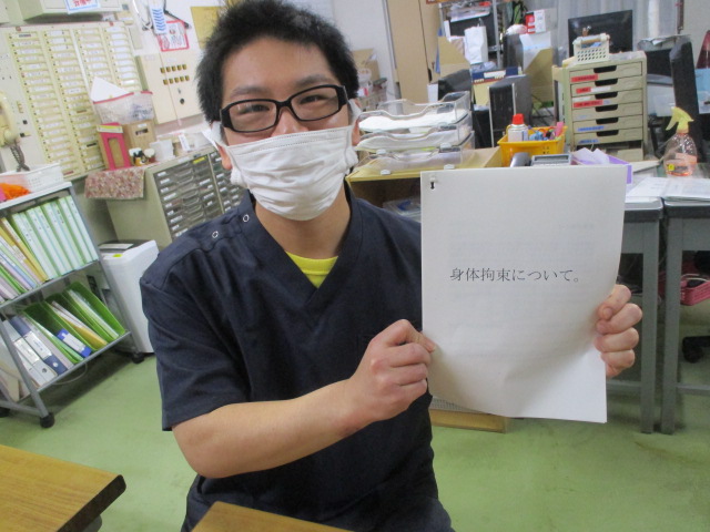 毎月勉強会を実施しておりますが、本日は身体拘束についての勉強会でした。現在は身体拘束が原則禁止となっている為、その理由とどのような行為が拘束にあたるのか学びました。