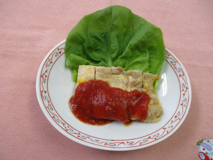 ご飯、かぶととろろ昆布のみそ汁、チキンピカタ、いんげんとえびの炒め物、