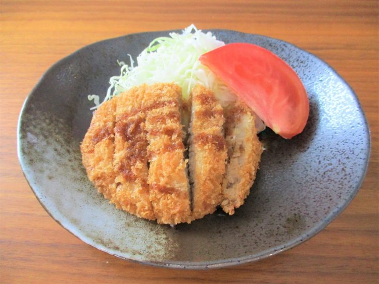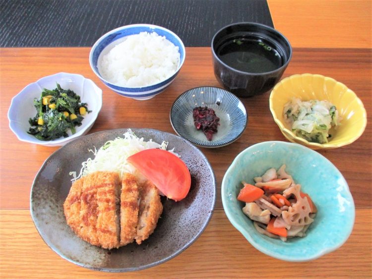 ご飯、わかめスープ、とんかつ、れんこんの煮物、はりはりサラダ、ほうれん草の和え物、
