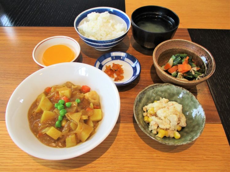 ご飯、コンソメスープ、チキンカレー、小松菜の中華炒め、ツナマヨ和え、オレンジゼリー、
