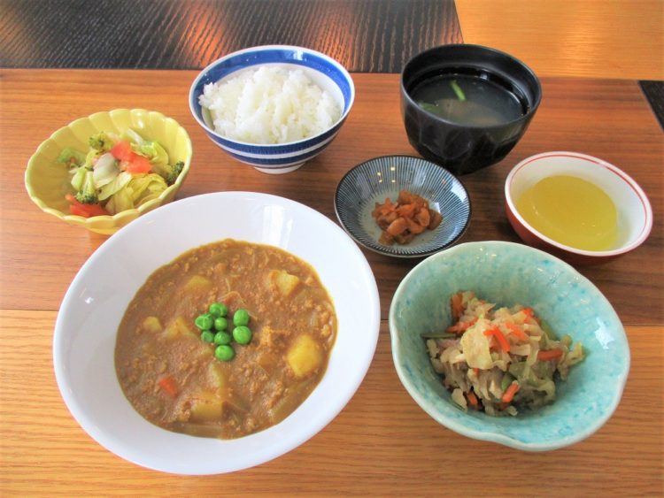 ご飯、あさりとニラのスープ、ひき肉のカレー、切干大根の炒め煮、青じそサラダ、