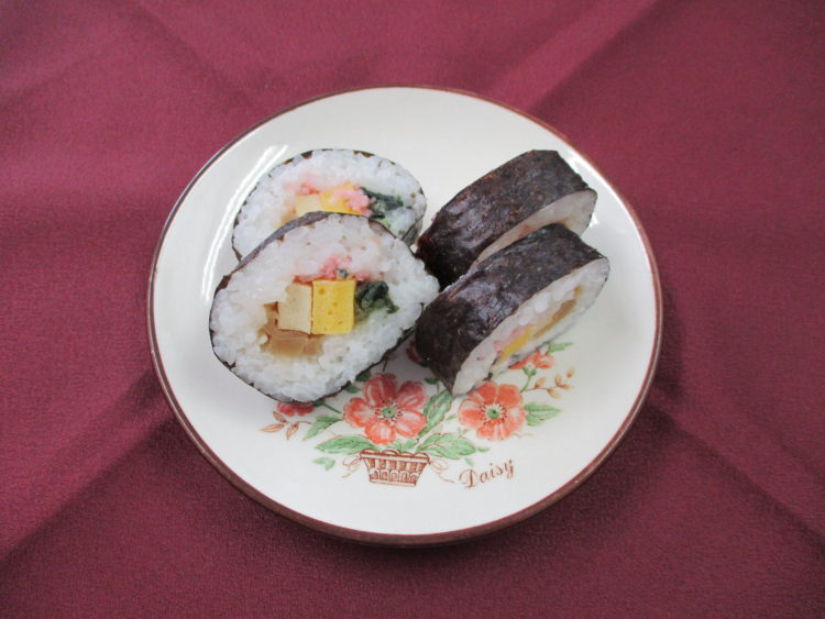 太巻き寿司、なるとと三つ葉のみそ汁、鶏肉の竜田揚げ、細竹とさつま揚げの炒め煮、白菜の海苔和え、白かぶ漬、フルーツみつ豆